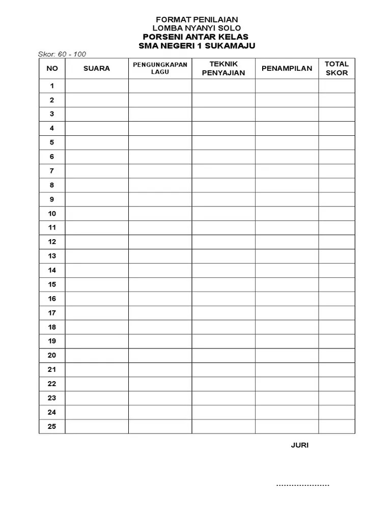 Download & view format penilaian nyanyi solo as pdf for free. Nama peserta bidang penilaian jumlah ket. Format penilaian lomba menyanyi kategori a nonama peserta & (no . Teknis pendaftaran dan pelaksanaan lomba. Akan masuk ke dalam form penilaian dan like terbanyak yang sesuai .